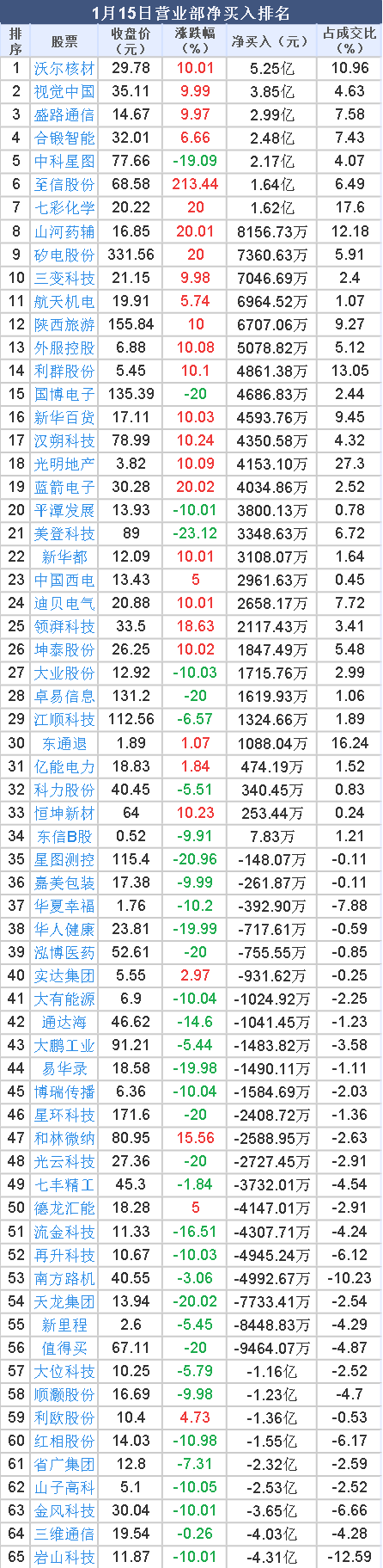 2026年1月15日, 大智慧 数据中心显示,龙虎榜中营业部净买入8018.49万元。其中,净买入的个股34只,营业部净买入较多个股分别是 沃尔核材 、 视觉中国 、 盛路通信 等,净买入金额占当日成交额比例达10.96%、4.63%、7.58%。