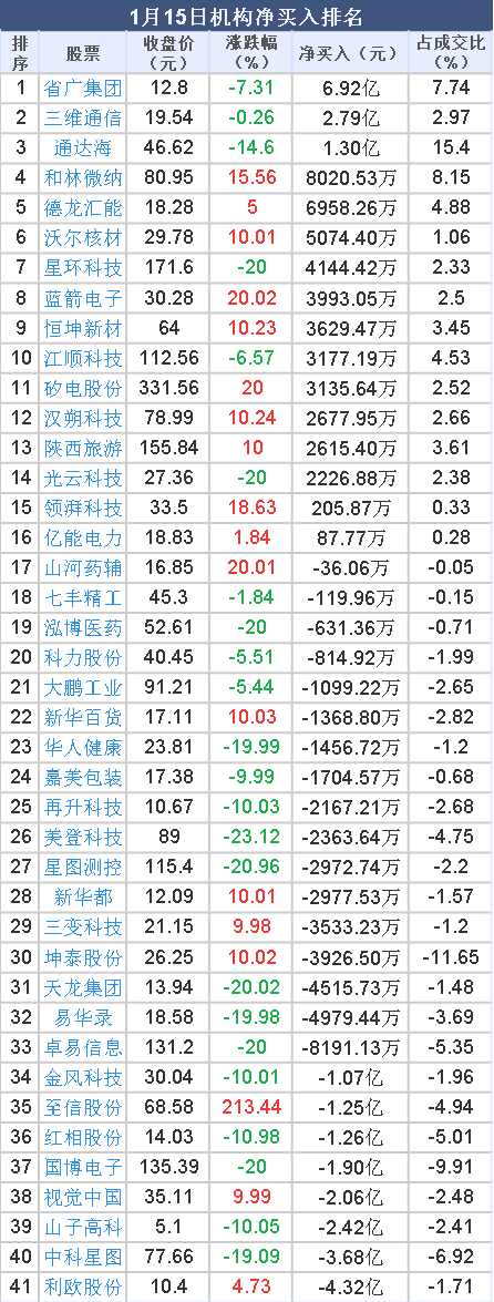 2026年1月15日,大智慧数据中心显示,龙虎榜中机构净卖出6.64亿元。其中,净买入的个股16只,机构净买入较多个股分别是 省广集团 、三维通信、 通达海 等,净买入金额占当日成交额比例达7.74%、2.97%、15.40%。
