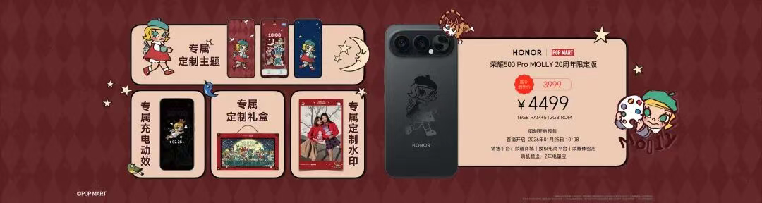 该限定款手机由荣耀和 泡泡玛特 联名打造,售价为4499元,国补后到手价3999元,1月25日10点08分正式开售。