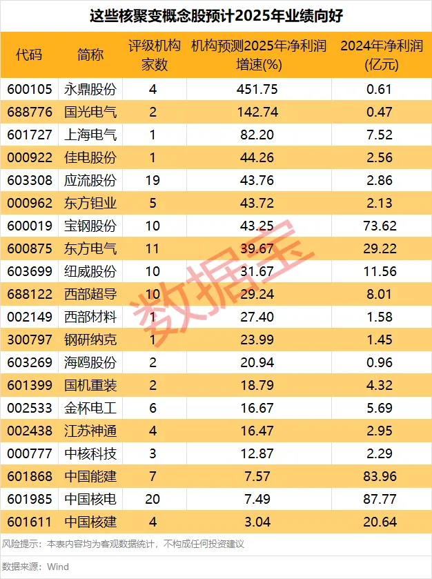 根据机构一致预测,有20只核聚变概念股2025年净利润有望实现增长(不含扭亏)。其中,机构一致预测 永鼎股份 和 国光电气 净利润有望翻倍,预测增幅分别为451.75%、142.74%; 上海电气 预测增幅超过80%; 佳电股份 、 应流股份 、 东方钽业 、 宝钢股份 预测增幅在40%以上。