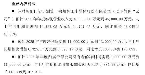 神工股份 (688233)1月23日晚间公告称,预计2025年度归属于母公司所有者的净利润实现9000万元到1.1亿元,同比增长118.71%到167.31%。对于业绩变动原因,公司表示,报告期内,全球 半导体 市场持续回暖。其中,海外市场受到 人工智能 需求拉动,高端逻辑、存储 芯片 制造厂开工率持续提升,资本开支有所增加,带动公司大直径硅材料业务收入稳步增长;中国本土市场国产替代加速,资本开支持续增长,特别是存储芯片制造厂在技术和产能两方面紧跟全球先进水平,对关键耗材需求增加,带动公司硅零部件业务收入快速增长。