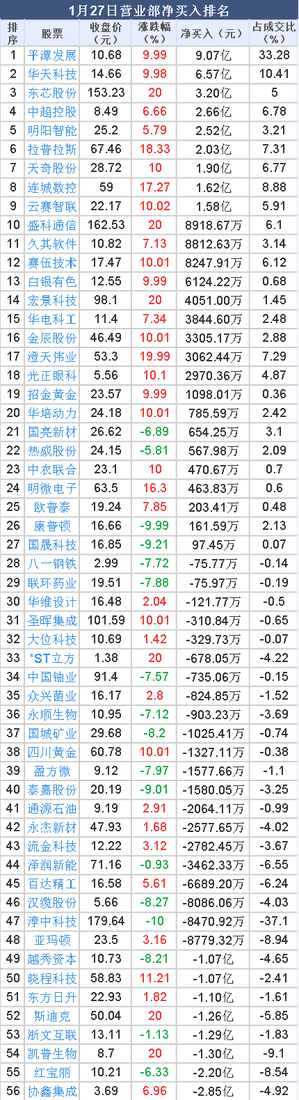 2026年1月27日, 大智慧 数据中心显示,龙虎榜中营业部净买入19.15亿元。其中,净买入的个股27只,营业部净买入较多个股分别是 平潭发展 、 华天科技 、 东芯股份 等,净买入金额占当日成交额比例达33.28%、10.41%、5.00%。
