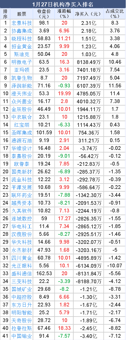 2026年1月27日,大智慧数据中心显示,龙虎榜中机构净卖出6.01亿元。其中,净买入的个股16只,机构净买入较多个股分别是 宏景科技 、协鑫集成、 晓程科技 等,净买入金额占当日成交额比例达8.30%、3.76%、3.38%。