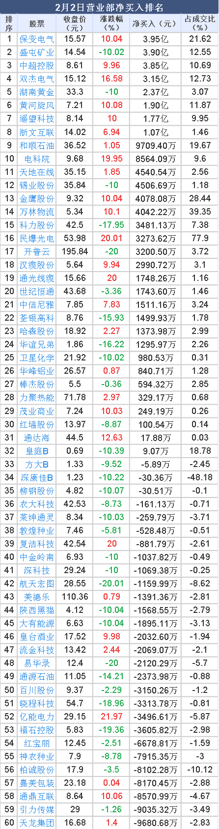 2026年2月2日, 大智慧 数据中心显示,龙虎榜中营业部净买入19.01亿元。其中,净买入的个股32只,营业部净买入较多个股分别是 保变电气 、 盛屯矿业 、 中超控股 等,净买入金额占当日成交额比例达21.62%、12.55%、10.69%。