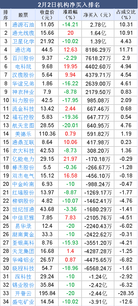 2026年2月2日,大智慧数据中心显示,龙虎榜中机构净卖出4.02亿元。其中,净买入的个股16只,机构净买入较多个股分别是 通源石油 、 通光线缆 、 卫星化学 等,净买入金额占当日成交额比例达10.31%、10.91%、4.43%。