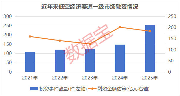 2025年,低空经济发展迎来里程碑式突破,制度建设与体系构建协同发力。随着政策持续完善、适航认证加速落地、技术装备不断突破、场景应用持续拓宽,行业订单满满当当、赛道认可度显著提升,资本关注度也步入高峰。IT桔子数据显示,2025年低空经济赛道一级市场投资事件数量达255件,同比增长七成以上,融资总额达到183.31亿元,为过去五年第二高。