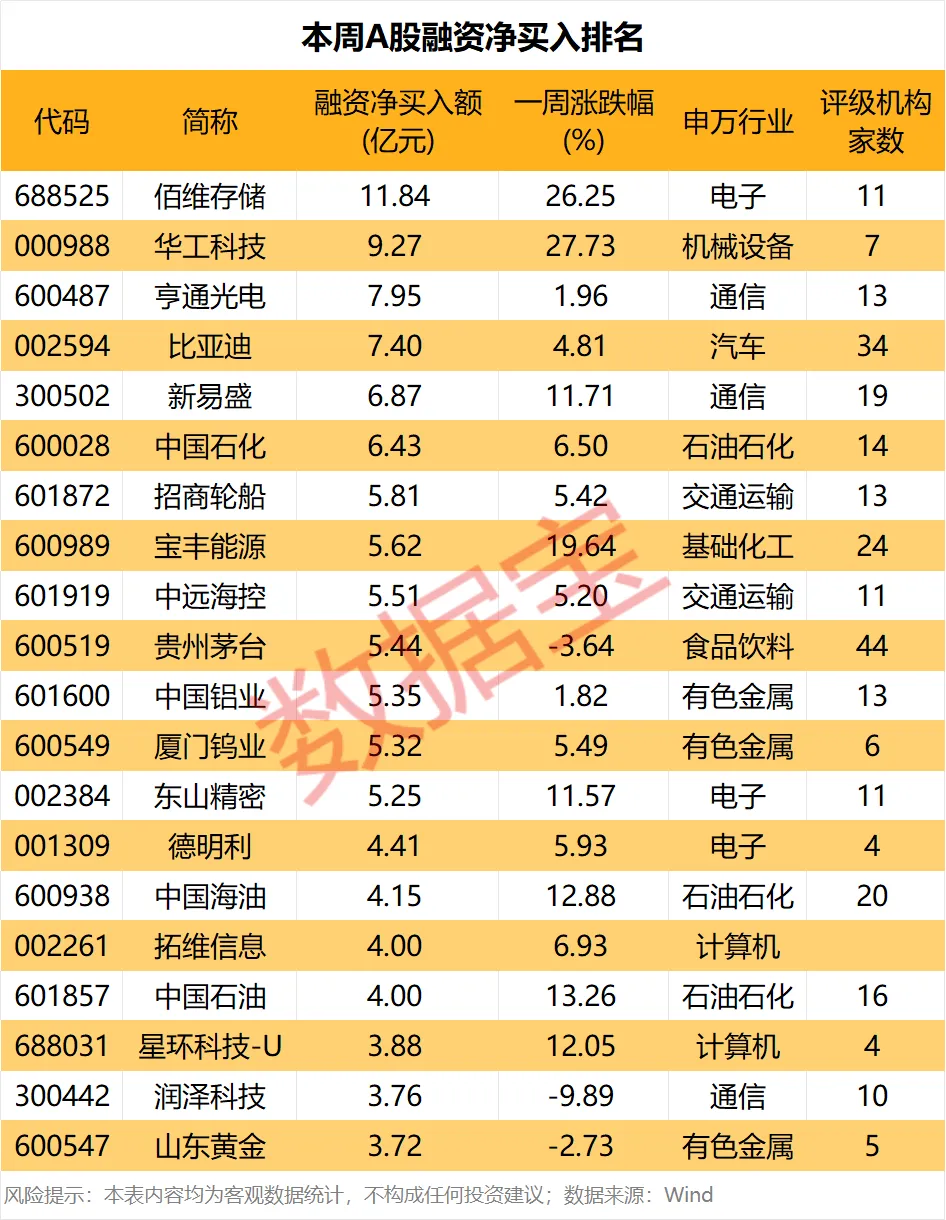 个股方面,本周27股融资净买入额在3亿元以上。 佰维存储 、 华工科技 、 亨通光电 、 比亚迪 净买入额在7亿元以上,其中佰维存储金额最高,为11.84亿元。
