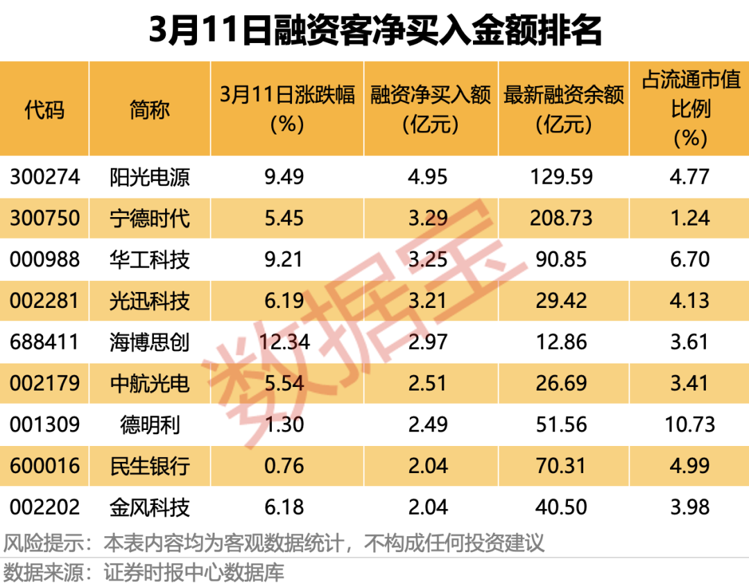据证券时报·数据宝统计,3月11日,共40股融资净买入额均超1亿元。 储能 概念龙头 阳光电源 融资净买入额居首,当日净买入4.95亿元。