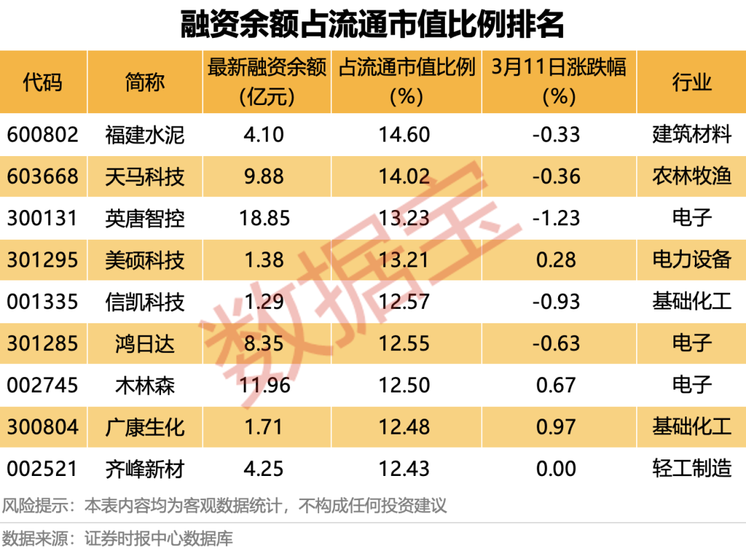 融资余额占流通市值比例最高的是 福建水泥 ,最新融资余额为4.1亿元,占流通市值比例达14.6%。其次是 天马科技 、 英唐智控 ,融资余额占流通市值比例分别为14.02%、13.23%。