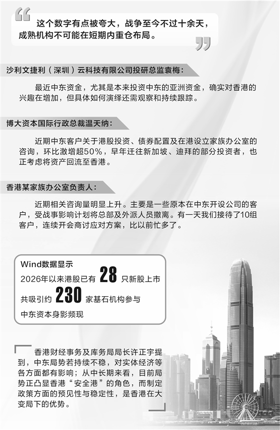 记者从香港某家族办公室负责人处也得到印证,近期相关咨询量明显上升。“主要是一些原本在中东开设公司的客户,受战事影响计划将总部及外派人员撤离。有一天我们接待了10组客户,连续开会商讨应对方案,比以前忙多了。”
