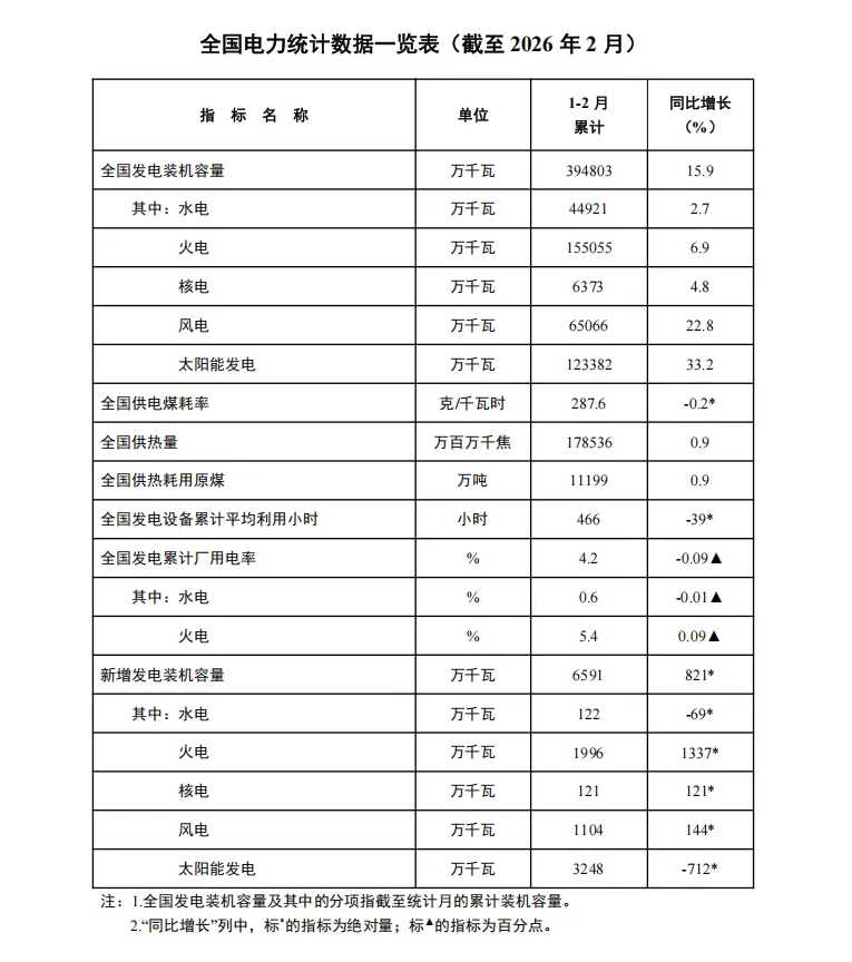 国家能源局发布2026年1-2月份全国 电力 统计数据。截至2月底,全国累计发电装机容量39.5亿千瓦,同比增长15.9%。其中, 太阳能 发电装机容量12.3亿千瓦,同比增长33.2%;风电装机容量6.5亿千瓦,同比增长22.8%。1-2月份,全国发电设备累计平均利用466小时,比上年同期降低39小时。