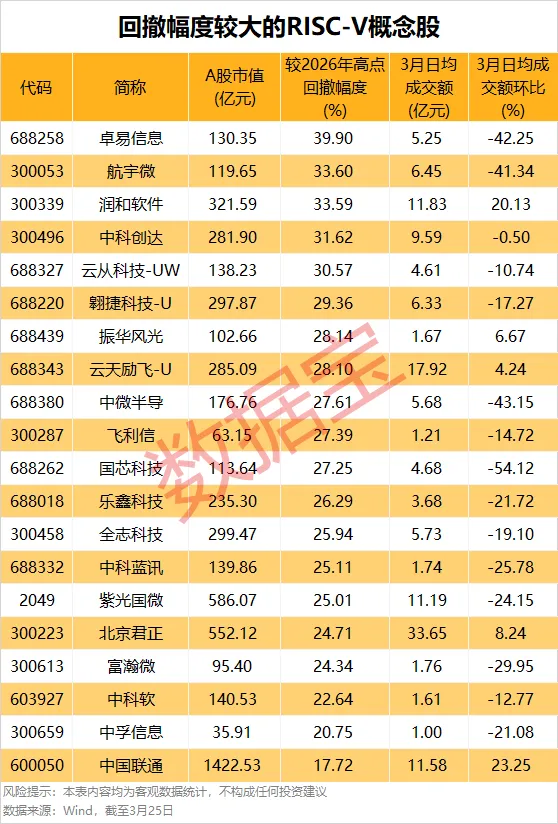 从股价表现来看,以3月25日收盘价与2026年以来高点相比,19只RISC-V概念股回撤幅度超20%。 卓易信息 、 航宇微 、 润和软件 、中科创达、 云从科技 -UW等回撤幅度居前。