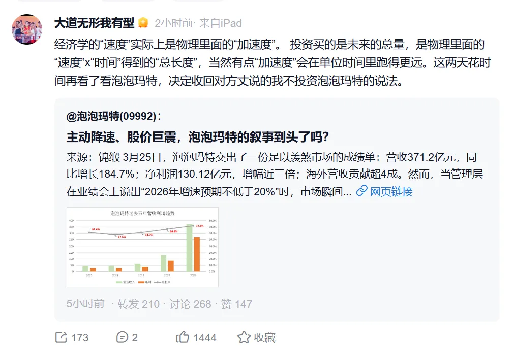 3月30日,段永平表示,经济学的“速度”实际上是物理里面的“加速度”。投资买的是未来的总量,是物理里面的“速度”x“时间”得到的“总长度”,当然有点“加速度”会在单位时间里跑得更远。这两天花时间再看了看泡泡玛特,决定收回对方丈(方三文)说的我不投资泡泡玛特的说法。