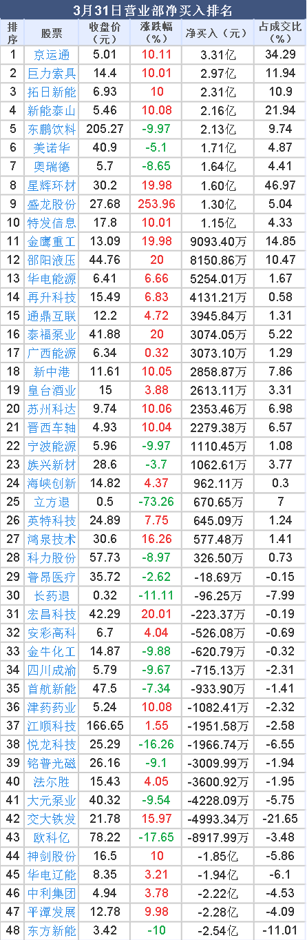 2026年3月31日, 大智慧 数据中心显示,龙虎榜中营业部净买入11.39亿元。其中,净买入的个股28只,营业部净买入较多个股分别是 京运通 、 巨力索具 、 拓日新能 等,净买入金额占当日成交额比例达34.29%、11.94%、10.90%。