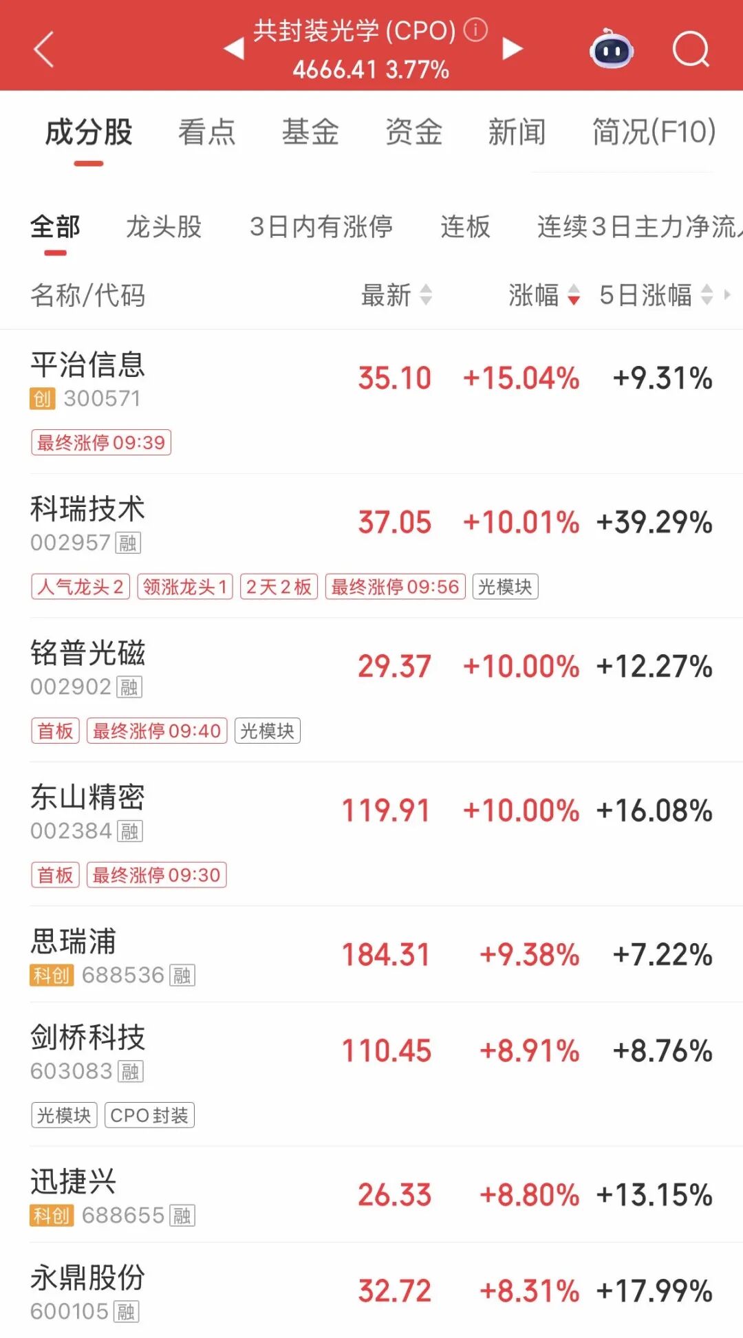 科瑞技术 、 铭普光磁 、 东山精密 涨停, 平治信息 涨超15%, 思瑞浦 、 剑桥科技 等个股涨幅居前。