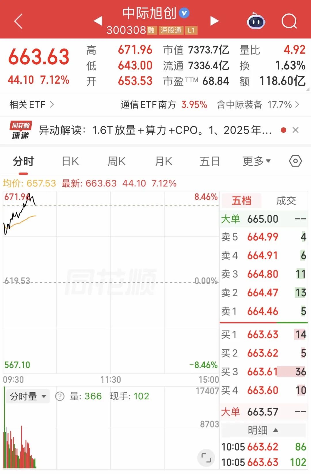 今日早盘,A股 CPO概念 高开高走,光模块龙头 中际旭创 (300308)盘中涨超8%,股价创历史新高,截至发稿涨超7%,成交额达118亿元,总市值超7300亿元。