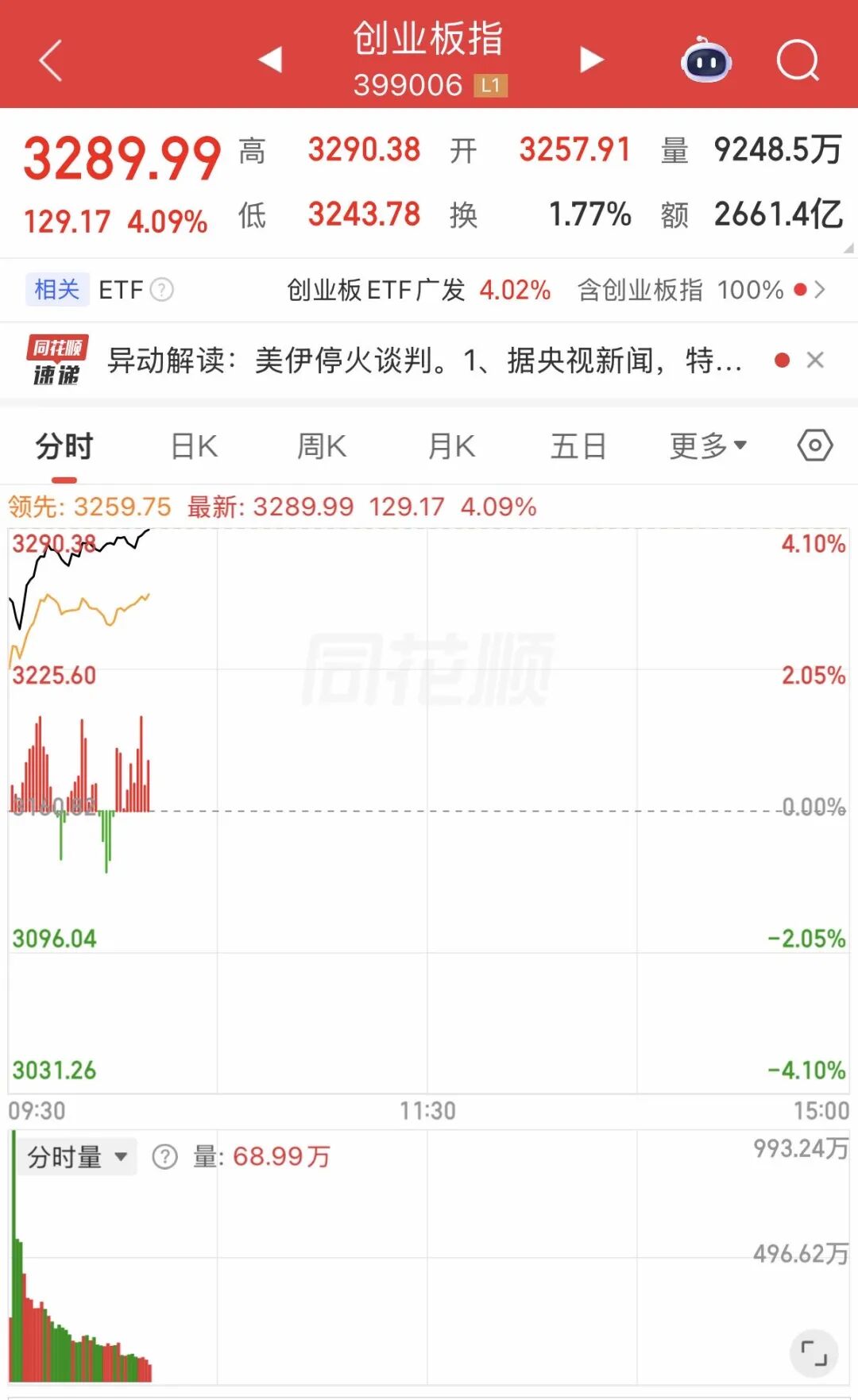 截至发稿,创业板指涨超4%。全市场成交额超1万亿元,较上个交易日此时放量3537亿元。