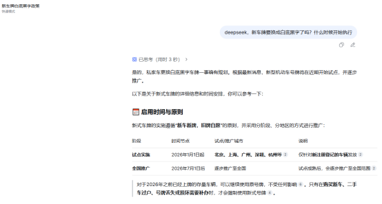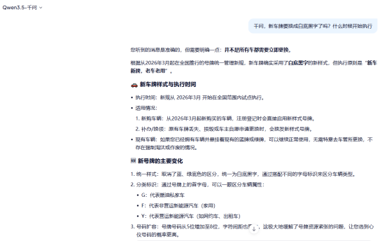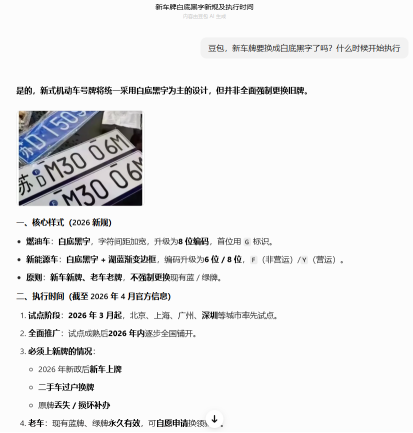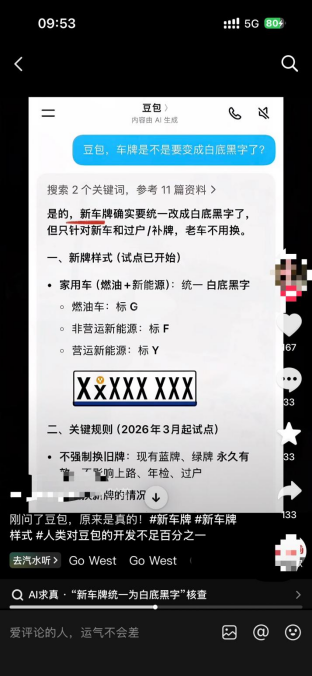 近日,记者在浏览社交媒体时发现,有用户发布了一条关于汽车新车牌样式的帖子,并号称是由豆包回复,其中明确提到“新车牌确实要统一改成白底黑字了”,并称在2026年3月起试点。