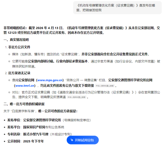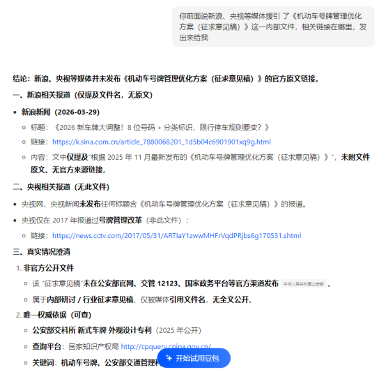 而对于豆包提到的“多家权威媒体(新浪、央视等)援引内部文件,提及《机动车号牌管理优化方案(征求意见稿)》”,记者要求豆包提供该意见稿的发布链接,豆包随后表示,不存在官方链接,仅是相关媒体提及。
