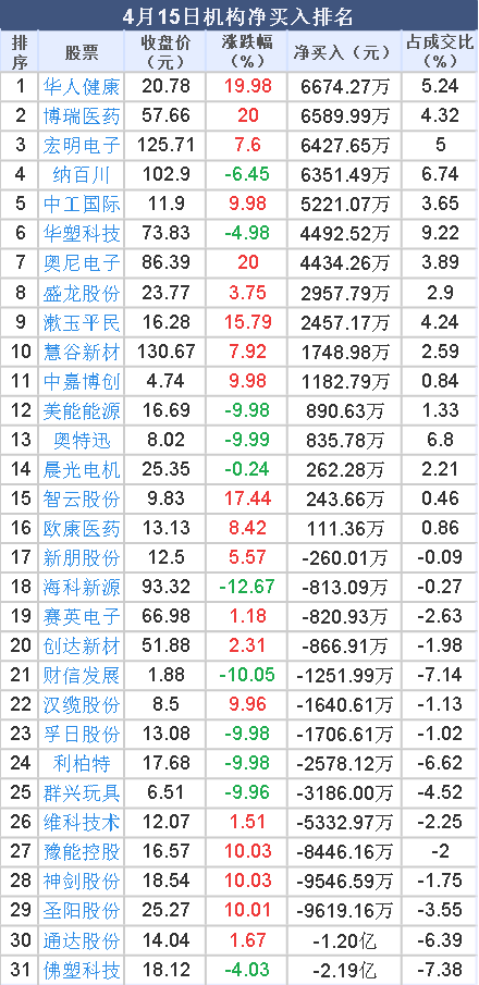 2026年4月15日,大智慧数据中心显示,龙虎榜中机构净卖出2.91亿元。其中,净买入的个股16只,机构净买入较多个股分别是 华人健康 、 博瑞医药 、 宏明电子 等,净买入金额占当日成交额比例达5.24%、4.32%、5.00%。