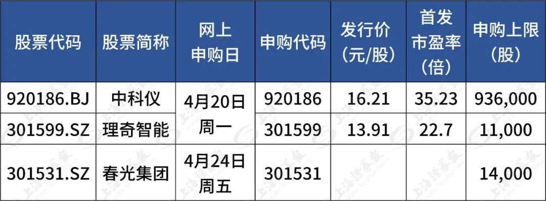 据目前安排,若无变化,下周(4月20日至24日)有3只新股可申购,分别为创业板2只和北交所1只。