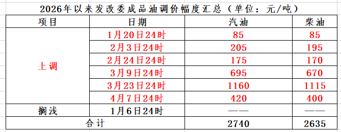 2026年以来,国内成品油零售限价已经历七轮调整窗口,分别为“六涨零跌一搁浅”,国内汽油、柴油价格每吨较2025年底分别上涨2740元、2635元。