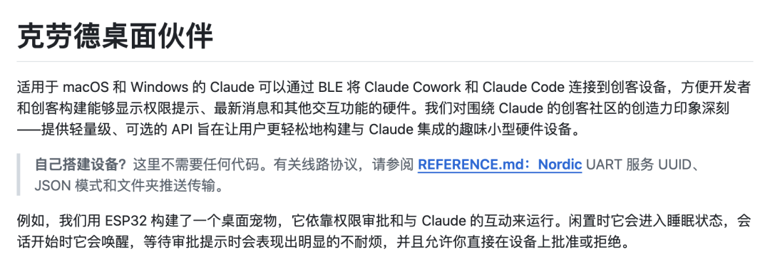 近日,Anthropic相关claude-desktop-buddy项目源码被上传至GitHub平台。网站原文中提到,适用于macOS和Windows的Claude可以通过BLE将Claude Cowork和Claude Code连接到创客设备,方便开发者和创客构建能够显示权限提示、最新消息和其他交互功能的硬件。