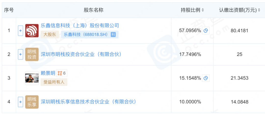 深圳市明栈信息科技有限公司成立于2017年,公司主营业务为提供模块化、开源物联网开发解决方案,包括易用硬件、直观软件和定制化服务,应用于工业物联网、智能零售、家居自动化、 人工智能 应用和STEM教育领域。乐鑫科技为其股东,持有57.1%的股份。