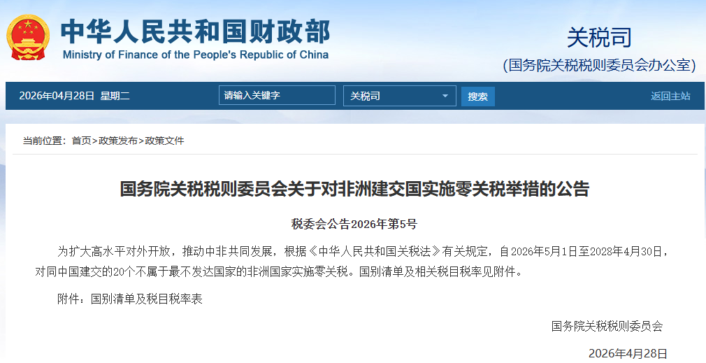 为积极落实上述举措,国务院关税税则委员会发布公告,自2026年5月1日至2028年4月30日,对同中国建交的20个不属于最不发达国家的非洲国家以特惠税率形式实施零关税;其中关税配额产品仅将配额内关税税率降为零,配额外关税税率不变。2年实施期内,中方将继续推动与相关非洲国家商签共同发展经济伙伴关系协定。