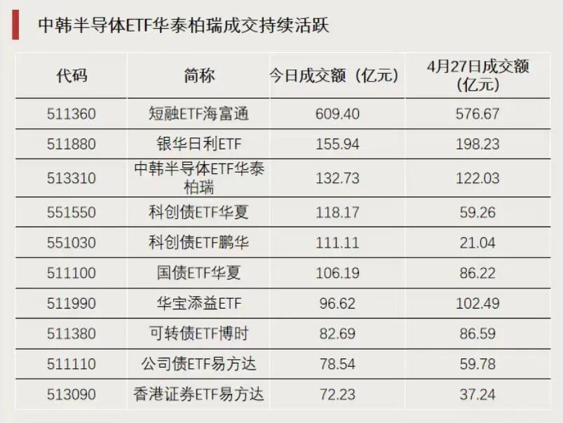 值得一提的是,中韩半导体ETF华泰柏瑞成交132.73亿元;4月27日,中韩半导体ETF华泰柏瑞成交额为122.03亿元,该ETF已连续两个交易日成交额超120亿元。