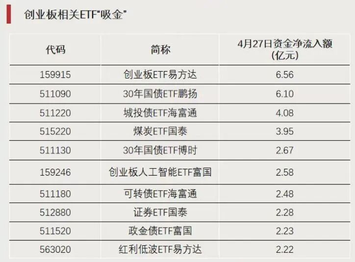 从资金流向看,4月27日,创业板ETF易方达获资金净流入6.56亿元,居全市场首位;创业板人工智能ETF富国获资金净流入2.58亿元。