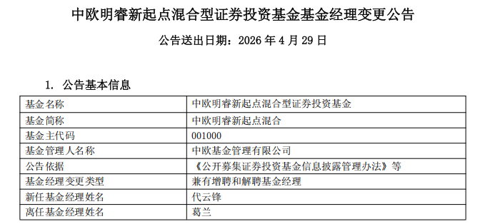 中欧基金4月29日公告显示,自4月28日起,中欧明睿新起点的基金经理由葛兰变更为代云锋。