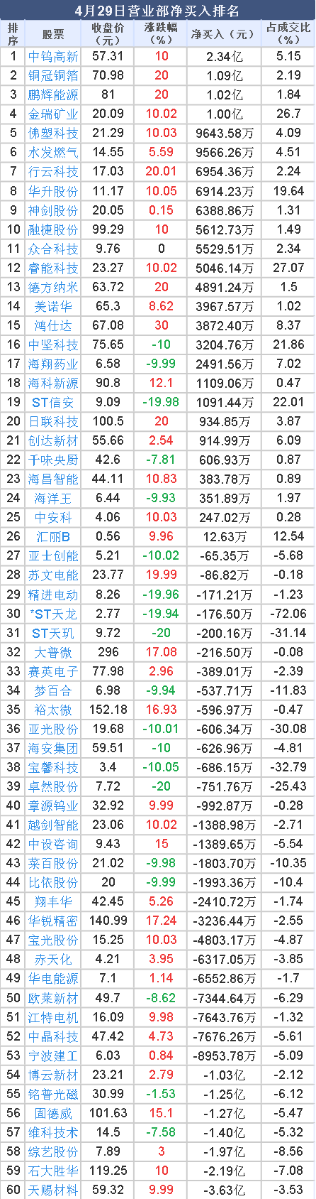 2026年4月29日, 大智慧 数据中心显示,龙虎榜中营业部净卖出6.08亿元。其中,净买入的个股26只,营业部净买入较多个股分别是 中钨高新 、 铜冠铜箔 、 鹏辉能源 等,净买入金额占当日成交额比例达5.15%、2.19%、1.84%。