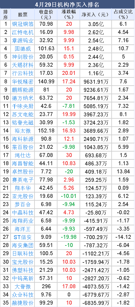 2026年4月29日,大智慧数据中心显示,龙虎榜中机构净买入18.69亿元。其中,净买入的个股23只,机构净买入较多个股分别是铜冠铜箔、 江特电机 、 章源钨业 等,净买入金额占当日成交额比例达6.10%、4.54%、7.16%。