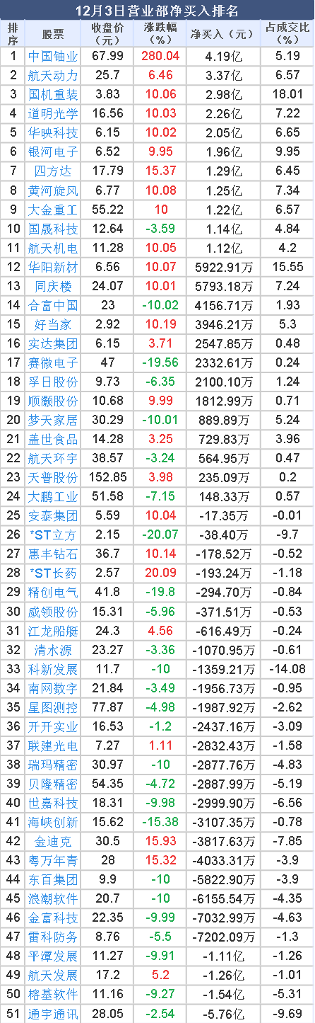 2025年12月3日, 大智慧 数据中心显示,龙虎榜中营业部净买入10.35亿元。其中,净买入的个股24只,营业部净买入较多个股分别是 中国铀业 、 航天动力 、 国机重装 等,净买入金额占当日成交额比例达5.19%、6.57%、18.01%。
