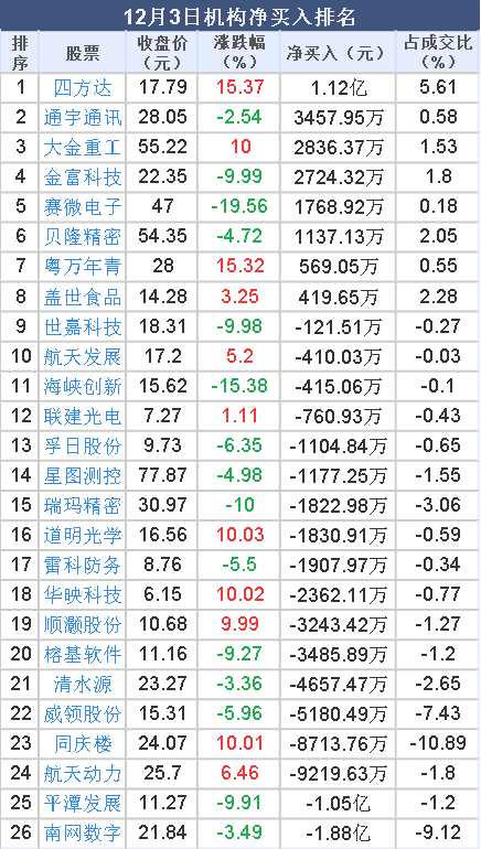2025年12月3日,大智慧数据中心显示,龙虎榜中机构净卖出5.16亿元。其中,净买入的个股8只,机构净买入较多个股分别是 四方达 、通宇通讯、 大金重工 等,净买入金额占当日成交额比例达5.61%、0.58%、1.53%。