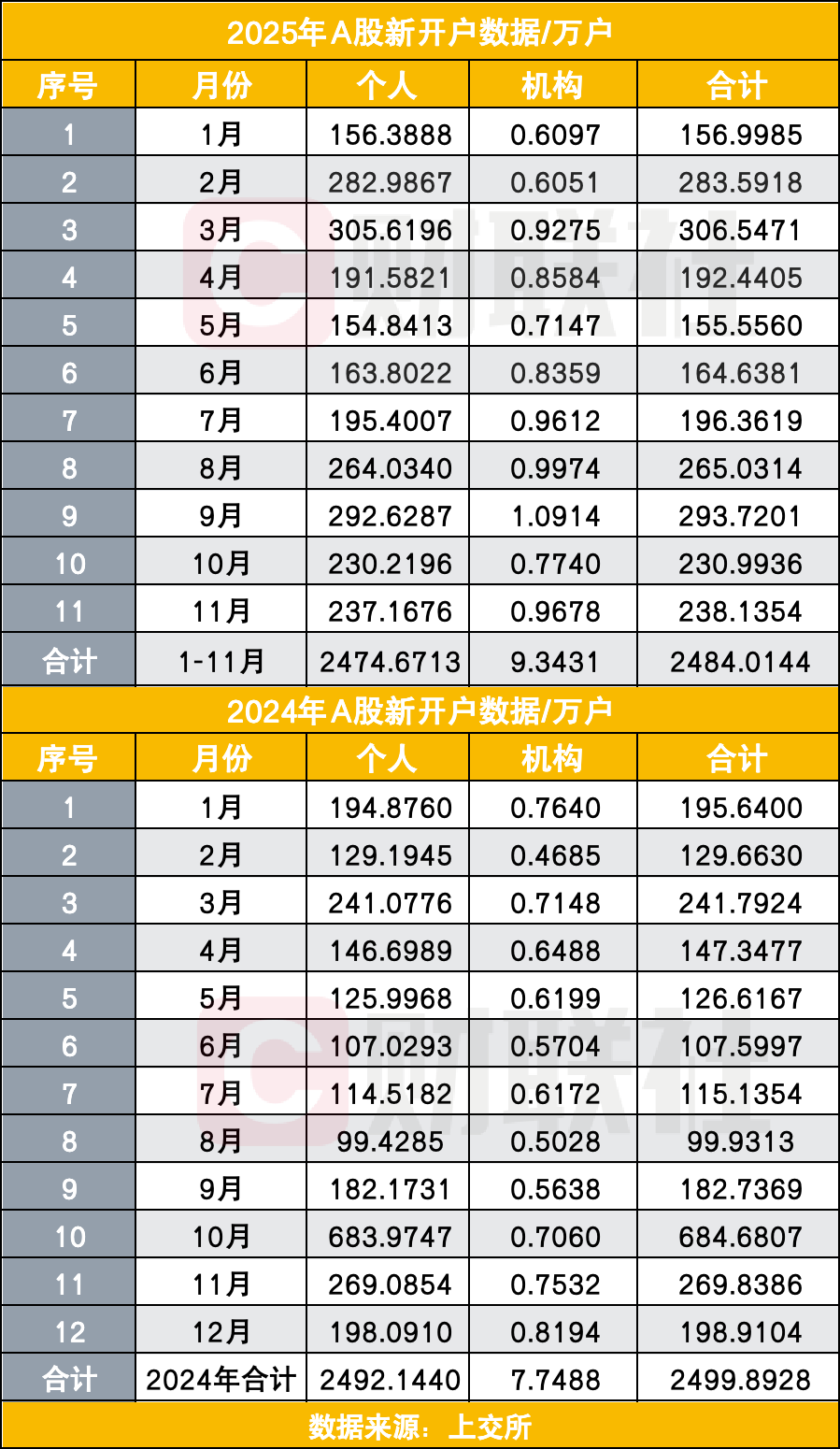 数据显示,今年前11个月个人投资者新开2475万户,较2024年同期增长7.87%,接近去年全年2492万户的总量。