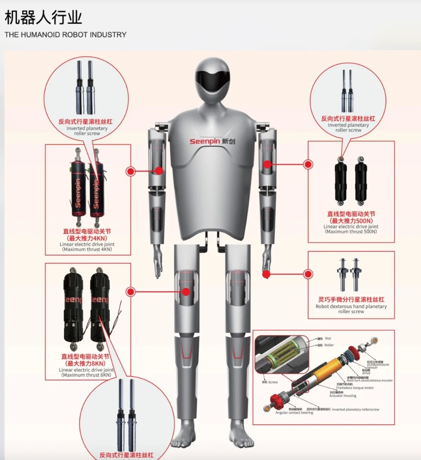 其中,丝杠是人形机器人价值量最高的核心硬件,也是新剑传动最为市场关注的产品。从设计结构而言,丝杠分为滑动丝杠、滚珠丝杠、滚柱丝杠等,多数产品在 汽车制造 、自动化生产线上已有成熟应用。凭借高精度、高承载和长寿命的特性,行星滚柱丝杠成为人形机器人关节控制的核心部件。