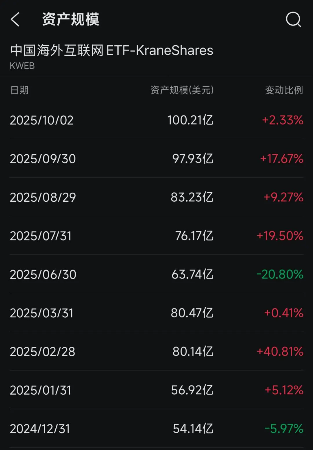 当前,华尔街对中国科技股的投资热情显著升温。多只在美上市的海外中国股票ETF规模大幅攀升。富途数据显示,截至10月2日,中国海外 互联网 ETF-KraneShares资产规模突破100亿美元大关,相较于上半年末的63.74亿美元增长近60%。